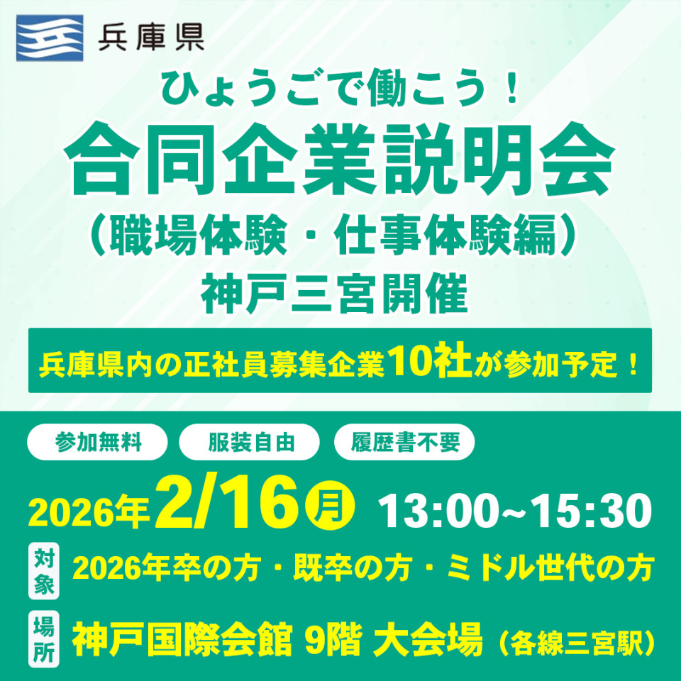 兵庫県内での就職を希望する2026年卒の方、既卒の方、ミドル世代の方